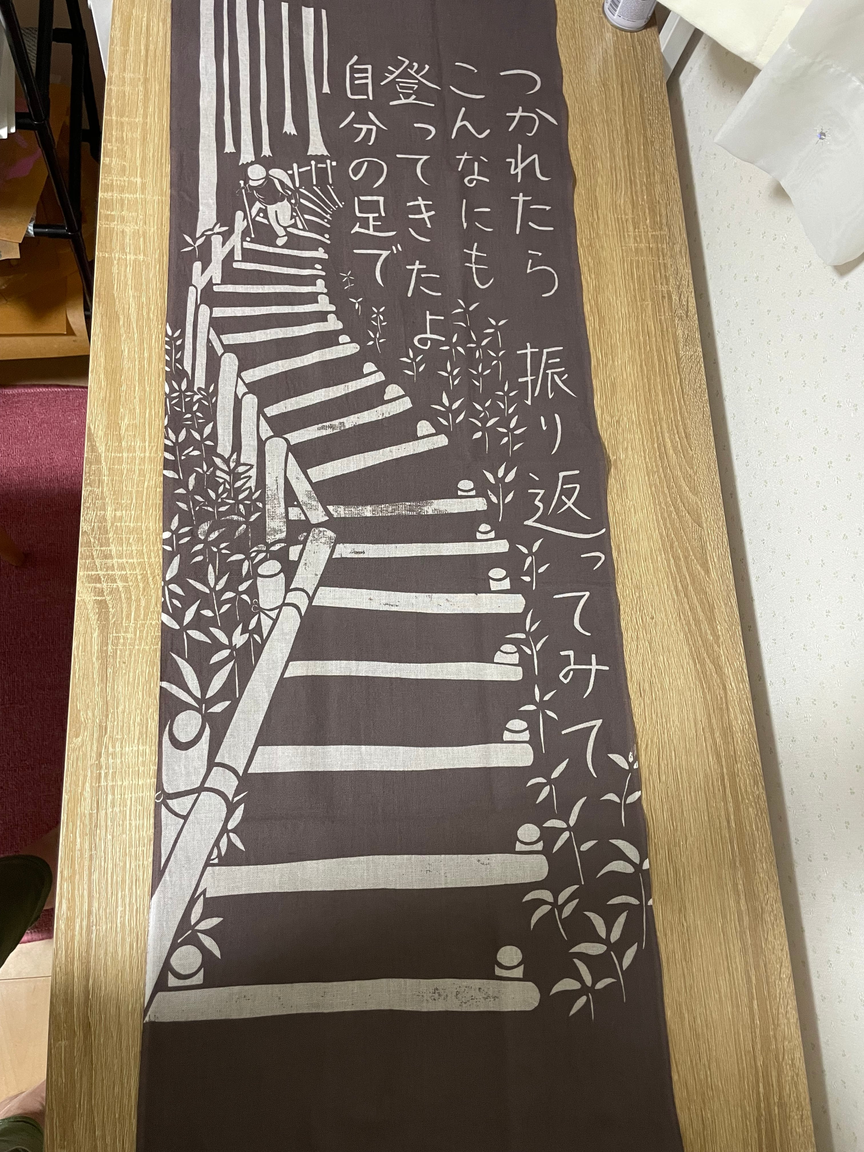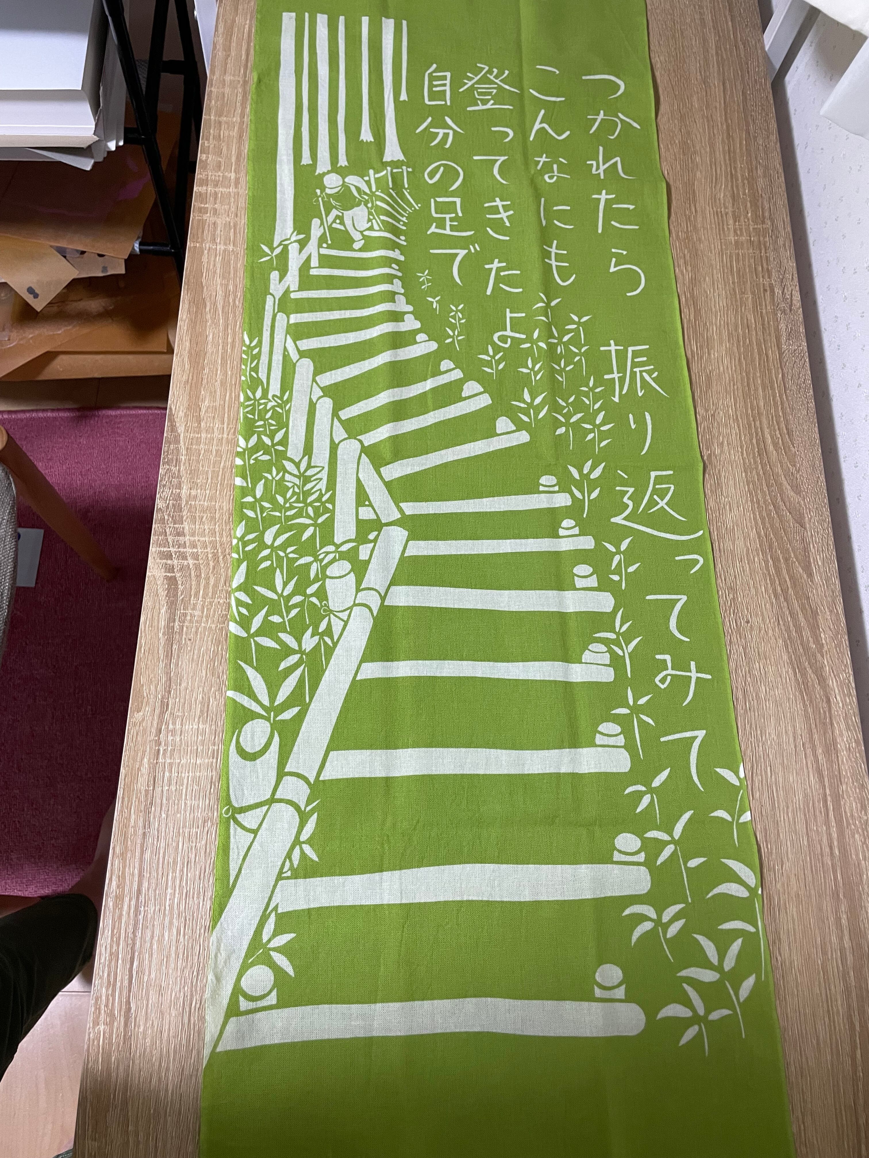 子供の頃に親にこうやって励まされて山に登ったなぁ。思い出と共に今も励まされている言葉を手ぬぐいにしました。